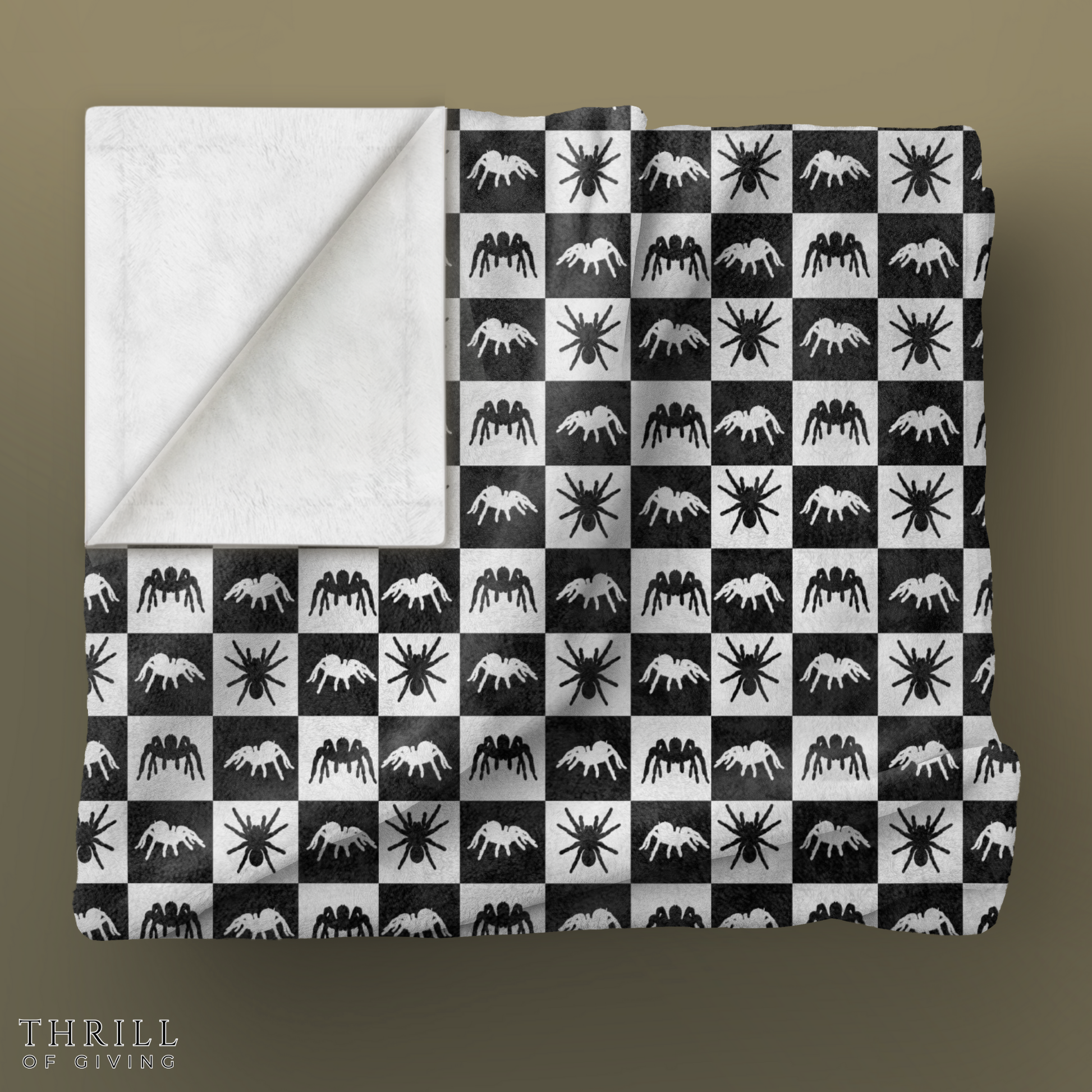 Featuring a playful mix of black and white spider silhouettes in a classic checkered design, this ultra-soft velveteen throw is perfect for cozying up on chilly nights. Made from high-quality plush fabric, it offers a luxurious feel while adding a unique statement to any room. Whether you're searching for the perfect housewarming gift, stylish minimal decor, or a cozy accent piece, this blanket brings warmth and personality to your home. Ideal for draping over a couch, layering on a bed, or snuggling up with your favorite book, this throw blends comfort with retro-inspired charm.